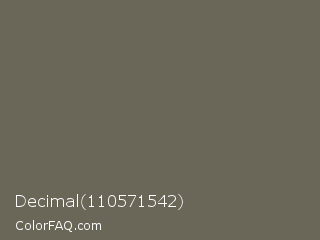 Decimal 110571542 Color is a normal yellow color and the nearest color is Coffee #706555. Hex code #6a6658 and RGB value is rgb(106,102,88). In RGB color space, this color is composed of 42% red, 40% green, 35% blue, In CMYK color space, this color is composed of 0% cyan, 4% magenta, 17% yellow , 58% black , In HSL color space, this color has a hue angle of 47° , 9% saturation and 38% lightness.