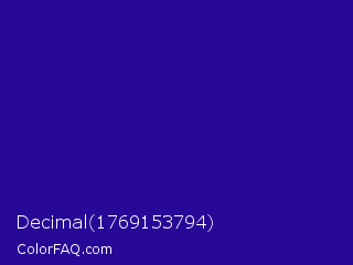 Decimal 1769153794 Color is a normal indigo color and the nearest color is Blue Gem #2c0e8c. Hex code #280896 and RGB value is rgb(40,8,150). In RGB color space, this color is composed of 16% red, 3% green, 59% blue, In CMYK color space, this color is composed of 73% cyan, 95% magenta, 0% yellow , 41% black , In HSL color space, this color has a hue angle of 254° , 90% saturation and 31% lightness.