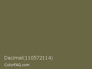 Decimal 110572114 Color is a normal yellow color and the nearest color is Finch #626649. Hex code #6a6744 and RGB value is rgb(106,103,68). In RGB color space, this color is composed of 42% red, 40% green, 27% blue, In CMYK color space, this color is composed of 0% cyan, 3% magenta, 36% yellow , 58% black , In HSL color space, this color has a hue angle of 55° , 22% saturation and 34% lightness.