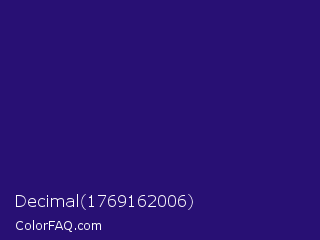 Decimal 1769162006 Color is a dark indigo color and the nearest color is Deep Blue #220878. Hex code #281074 and RGB value is rgb(40,16,116). In RGB color space, this color is composed of 16% red, 6% green, 45% blue, In CMYK color space, this color is composed of 66% cyan, 86% magenta, 0% yellow , 55% black , In HSL color space, this color has a hue angle of 254° , 76% saturation and 26% lightness.
