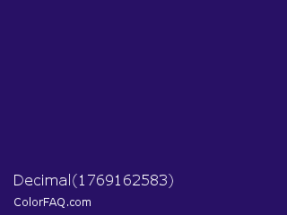 Decimal 1769162583 Color is a dark indigo color and the nearest color is Violent Violet #290c5e. Hex code #281165 and RGB value is rgb(40,17,101). In RGB color space, this color is composed of 16% red, 7% green, 40% blue, In CMYK color space, this color is composed of 60% cyan, 83% magenta, 0% yellow , 60% black , In HSL color space, this color has a hue angle of 256° , 71% saturation and 23% lightness.