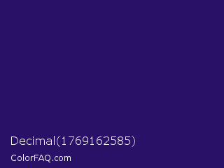 Decimal 1769162585 Color is a dark indigo color and the nearest color is Violent Violet #290c5e. Hex code #281167 and RGB value is rgb(40,17,103). In RGB color space, this color is composed of 16% red, 7% green, 40% blue, In CMYK color space, this color is composed of 61% cyan, 83% magenta, 0% yellow , 60% black , In HSL color space, this color has a hue angle of 256° , 72% saturation and 24% lightness.