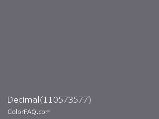 Decimal 110573577 Color is a normal indigo color and the nearest color is Dove Gray #6d6c6c. Hex code #6a6971 and RGB value is rgb(106,105,113). In RGB color space, this color is composed of 42% red, 41% green, 44% blue, In CMYK color space, this color is composed of 6% cyan, 7% magenta, 0% yellow , 56% black , In HSL color space, this color has a hue angle of 248° , 4% saturation and 43% lightness.