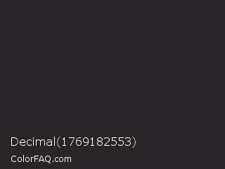 Decimal 1769182553 Color is a very dark magenta color and the nearest color is Raisin Black #242124. Hex code #282427 and RGB value is rgb(40,36,39). In RGB color space, this color is composed of 16% red, 14% green, 15% blue, In CMYK color space, this color is composed of 0% cyan, 10% magenta, 3% yellow , 84% black , In HSL color space, this color has a hue angle of 315° , 5% saturation and 15% lightness.