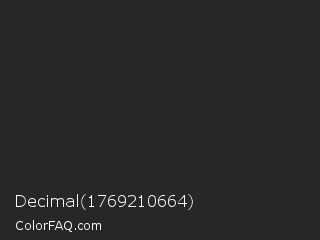 Decimal 1769210664 Color is a very dark magenta color and the nearest color is Shark #25272c. Hex code #282728 and RGB value is rgb(40,39,40). In RGB color space, this color is composed of 16% red, 15% green, 16% blue, In CMYK color space, this color is composed of 0% cyan, 3% magenta, 0% yellow , 84% black , In HSL color space, this color has a hue angle of 300° , 1% saturation and 15% lightness.