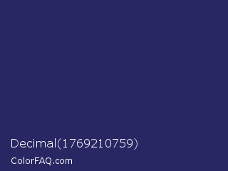 Decimal 1769210759 Color is a dark indigo color and the nearest color is Biscay #1b3162. Hex code #282763 and RGB value is rgb(40,39,99). In RGB color space, this color is composed of 16% red, 15% green, 39% blue, In CMYK color space, this color is composed of 60% cyan, 61% magenta, 0% yellow , 61% black , In HSL color space, this color has a hue angle of 241° , 43% saturation and 27% lightness.