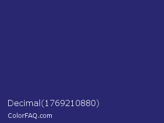 Decimal 1769210880 Color is a dark indigo color and the nearest color is St Patricks Blue #23297a. Hex code #282770 and RGB value is rgb(40,39,112). In RGB color space, this color is composed of 16% red, 15% green, 44% blue, In CMYK color space, this color is composed of 64% cyan, 65% magenta, 0% yellow , 56% black , In HSL color space, this color has a hue angle of 241° , 48% saturation and 30% lightness.