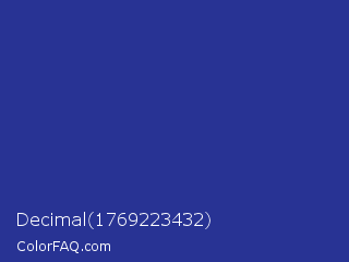 Decimal 1769223432 Color is a normal blue color and the nearest color is Blue Pigment #333399. Hex code #283394 and RGB value is rgb(40,51,148). In RGB color space, this color is composed of 16% red, 20% green, 58% blue, In CMYK color space, this color is composed of 73% cyan, 66% magenta, 0% yellow , 42% black , In HSL color space, this color has a hue angle of 234° , 57% saturation and 37% lightness.