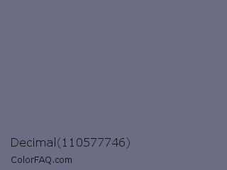 Decimal 110577746 Color is a normal blue color and the nearest color is Storm Gray #717486. Hex code #6a6d84 and RGB value is rgb(106,109,132). In RGB color space, this color is composed of 42% red, 43% green, 52% blue, In CMYK color space, this color is composed of 20% cyan, 17% magenta, 0% yellow , 48% black , In HSL color space, this color has a hue angle of 233° , 11% saturation and 47% lightness.
