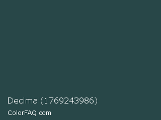 Decimal 1769243986 Color is a very dark cyan color and the nearest color is Japanese Indigo #264348. Hex code #284748 and RGB value is rgb(40,71,72). In RGB color space, this color is composed of 16% red, 28% green, 28% blue, In CMYK color space, this color is composed of 44% cyan, 1% magenta, 0% yellow , 72% black , In HSL color space, this color has a hue angle of 182° , 29% saturation and 22% lightness.
