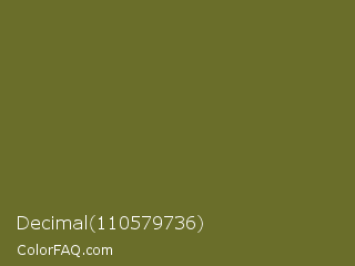 Decimal 110579736 Color is a dark yellow color and the nearest color is Fern Frond #657220. Hex code #6a6e2a and RGB value is rgb(106,110,42). In RGB color space, this color is composed of 42% red, 43% green, 16% blue, In CMYK color space, this color is composed of 4% cyan, 0% magenta, 62% yellow , 57% black , In HSL color space, this color has a hue angle of 64° , 45% saturation and 30% lightness.