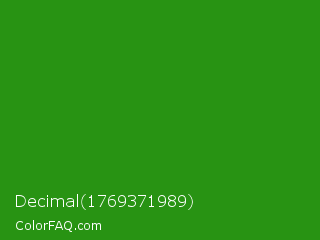 Decimal 1769371989 Color is a normal green color and the nearest color is Slimy Green #299617. Hex code #289313 and RGB value is rgb(40,147,19). In RGB color space, this color is composed of 16% red, 58% green, 7% blue, In CMYK color space, this color is composed of 73% cyan, 0% magenta, 87% yellow , 42% black , In HSL color space, this color has a hue angle of 110° , 77% saturation and 33% lightness.