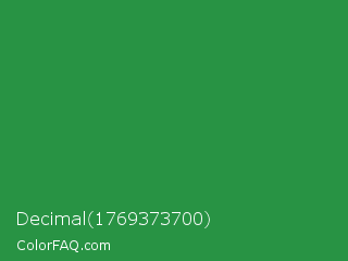 Decimal 1769373700 Color is a normal green color and the nearest color is Sea Green #2e8b57. Hex code #289344 and RGB value is rgb(40,147,68). In RGB color space, this color is composed of 16% red, 58% green, 27% blue, In CMYK color space, this color is composed of 73% cyan, 0% magenta, 54% yellow , 42% black , In HSL color space, this color has a hue angle of 136° , 57% saturation and 37% lightness.
