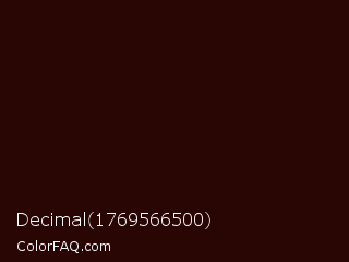 Decimal 1769566500 Color is a almost black red color and the nearest color is Sepia Black #2b0202. Hex code #290504 and RGB value is rgb(41,5,4). In RGB color space, this color is composed of 16% red, 2% green, 2% blue, In CMYK color space, this color is composed of 0% cyan, 88% magenta, 90% yellow , 84% black , In HSL color space, this color has a hue angle of 2° , 82% saturation and 9% lightness.