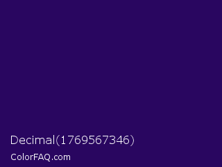 Decimal 1769567346 Color is a very dark violet color and the nearest color is Violent Violet #290c5e. Hex code #290660 and RGB value is rgb(41,6,96). In RGB color space, this color is composed of 16% red, 2% green, 38% blue, In CMYK color space, this color is composed of 57% cyan, 94% magenta, 0% yellow , 62% black , In HSL color space, this color has a hue angle of 263° , 88% saturation and 20% lightness.