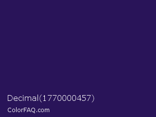 Decimal 1770000457 Color is a very dark indigo color and the nearest color is Violent Violet #290c5e. Hex code #291459 and RGB value is rgb(41,20,89). In RGB color space, this color is composed of 16% red, 8% green, 35% blue, In CMYK color space, this color is composed of 54% cyan, 78% magenta, 0% yellow , 65% black , In HSL color space, this color has a hue angle of 258° , 63% saturation and 21% lightness.