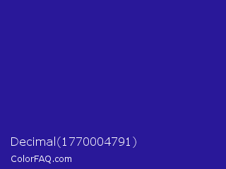 Decimal 1770004791 Color is a normal indigo color and the nearest color is Blue Gem #2c0e8c. Hex code #291899 and RGB value is rgb(41,24,153). In RGB color space, this color is composed of 16% red, 9% green, 60% blue, In CMYK color space, this color is composed of 73% cyan, 84% magenta, 0% yellow , 40% black , In HSL color space, this color has a hue angle of 248° , 73% saturation and 35% lightness.