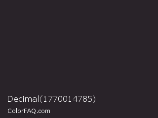 Decimal 1770014785 Color is a very dark magenta color and the nearest color is Shark #25272c. Hex code #292329 and RGB value is rgb(41,35,41). In RGB color space, this color is composed of 16% red, 14% green, 16% blue, In CMYK color space, this color is composed of 0% cyan, 15% magenta, 0% yellow , 84% black , In HSL color space, this color has a hue angle of 300° , 8% saturation and 15% lightness.