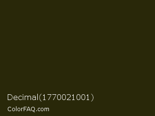 Decimal 1770021001 Color is a very dark yellow color and the nearest color is Onion #2f270e. Hex code #292809 and RGB value is rgb(41,40,9). In RGB color space, this color is composed of 16% red, 16% green, 4% blue, In CMYK color space, this color is composed of 0% cyan, 2% magenta, 78% yellow , 84% black , In HSL color space, this color has a hue angle of 58° , 64% saturation and 10% lightness.