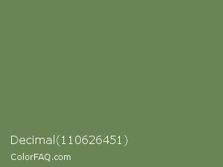 Decimal 110626451 Color is a normal green color and the nearest color is Glade Green #61845f. Hex code #6a8455 and RGB value is rgb(106,132,85). In RGB color space, this color is composed of 42% red, 52% green, 33% blue, In CMYK color space, this color is composed of 20% cyan, 0% magenta, 36% yellow , 48% black , In HSL color space, this color has a hue angle of 93° , 22% saturation and 43% lightness.