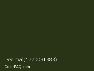 Decimal 1770031383 Color is a very dark green color and the nearest color is Mallard #233418. Hex code #293315 and RGB value is rgb(41,51,21). In RGB color space, this color is composed of 16% red, 20% green, 8% blue, In CMYK color space, this color is composed of 20% cyan, 0% magenta, 59% yellow , 80% black , In HSL color space, this color has a hue angle of 80° , 42% saturation and 14% lightness.