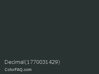 Decimal 1770031429 Color is a very dark cyan color and the nearest color is Gunmetal #2a3439. Hex code #293331 and RGB value is rgb(41,51,49). In RGB color space, this color is composed of 16% red, 20% green, 19% blue, In CMYK color space, this color is composed of 20% cyan, 0% magenta, 4% yellow , 80% black , In HSL color space, this color has a hue angle of 168° , 11% saturation and 18% lightness.