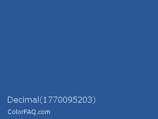 Decimal 1770095203 Color is a normal blue color and the nearest color is Cyan Cobalt Blue #28589c. Hex code #295797 and RGB value is rgb(41,87,151). In RGB color space, this color is composed of 16% red, 34% green, 59% blue, In CMYK color space, this color is composed of 73% cyan, 42% magenta, 0% yellow , 41% black , In HSL color space, this color has a hue angle of 215° , 57% saturation and 38% lightness.
