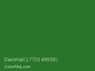 Decimal 1770149939 Color is a normal green color and the nearest color is Mughal Green #306030. Hex code #297529 and RGB value is rgb(41,117,41). In RGB color space, this color is composed of 16% red, 46% green, 16% blue, In CMYK color space, this color is composed of 65% cyan, 0% magenta, 65% yellow , 54% black , In HSL color space, this color has a hue angle of 120° , 48% saturation and 31% lightness.