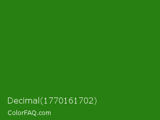Decimal 1770161702 Color is a dark green color and the nearest color is Bilbao #327c14. Hex code #298012 and RGB value is rgb(41,128,18). In RGB color space, this color is composed of 16% red, 50% green, 7% blue, In CMYK color space, this color is composed of 68% cyan, 0% magenta, 86% yellow , 50% black , In HSL color space, this color has a hue angle of 107° , 75% saturation and 29% lightness.
