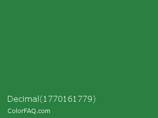 Decimal 1770161779 Color is a normal green color and the nearest color is Dark Spring Green #177245. Hex code #298041 and RGB value is rgb(41,128,65). In RGB color space, this color is composed of 16% red, 50% green, 25% blue, In CMYK color space, this color is composed of 68% cyan, 0% magenta, 49% yellow , 50% black , In HSL color space, this color has a hue angle of 137° , 51% saturation and 33% lightness.