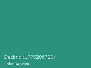 Decimal 1770206720 Color is a normal cyan color and the nearest color is Lochinvar #2c8c84. Hex code #299380 and RGB value is rgb(41,147,128). In RGB color space, this color is composed of 16% red, 58% green, 50% blue, In CMYK color space, this color is composed of 72% cyan, 0% magenta, 13% yellow , 42% black , In HSL color space, this color has a hue angle of 169° , 56% saturation and 37% lightness.