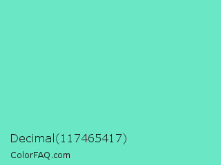 Decimal 117465417 Color is a light cyan color and the nearest color is Downy #6fd0c5. Hex code #6ae7c5 and RGB value is rgb(106,231,197). In RGB color space, this color is composed of 42% red, 91% green, 77% blue, In CMYK color space, this color is composed of 54% cyan, 0% magenta, 15% yellow , 9% black , In HSL color space, this color has a hue angle of 164° , 72% saturation and 66% lightness.