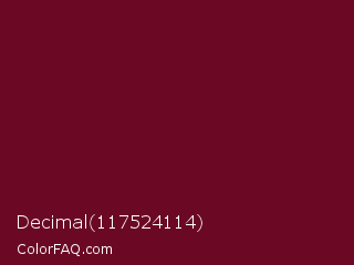Decimal 117524114 Color is a dark rose color and the nearest color is Black Rose #67032d. Hex code #6b0924 and RGB value is rgb(107,9,36). In RGB color space, this color is composed of 42% red, 4% green, 14% blue, In CMYK color space, this color is composed of 0% cyan, 92% magenta, 66% yellow , 58% black , In HSL color space, this color has a hue angle of 343° , 84% saturation and 23% lightness.