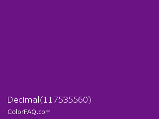 Decimal 117535560 Color is a dark purple color and the nearest color is Seance #731e8f. Hex code #6b1384 and RGB value is rgb(107,19,132). In RGB color space, this color is composed of 42% red, 7% green, 52% blue, In CMYK color space, this color is composed of 19% cyan, 86% magenta, 0% yellow , 48% black , In HSL color space, this color has a hue angle of 287° , 75% saturation and 30% lightness.