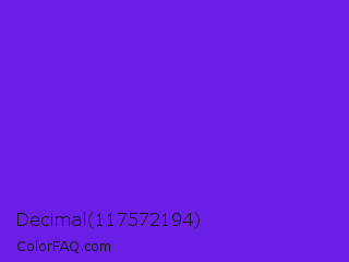 Decimal 117572194 Color is a normal violet color and the nearest color is Han Purple #5218fa. Hex code #6b1ee6 and RGB value is rgb(107,30,230). In RGB color space, this color is composed of 42% red, 12% green, 90% blue, In CMYK color space, this color is composed of 53% cyan, 87% magenta, 0% yellow , 10% black , In HSL color space, this color has a hue angle of 263° , 80% saturation and 51% lightness.
