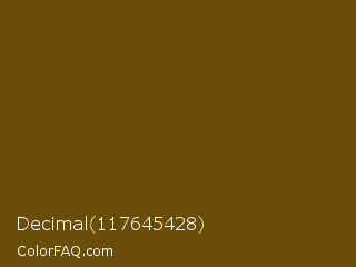 Decimal 117645428 Color is a dark orange color and the nearest color is Antique Bronze #704a07. Hex code #6b4d0a and RGB value is rgb(107,77,10). In RGB color space, this color is composed of 42% red, 30% green, 4% blue, In CMYK color space, this color is composed of 0% cyan, 28% magenta, 91% yellow , 58% black , In HSL color space, this color has a hue angle of 41° , 83% saturation and 23% lightness.