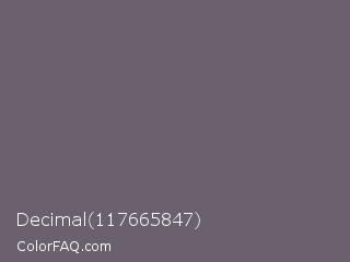 Decimal 117665847 Color is a normal purple color and the nearest color is Salt Box #685e6e. Hex code #6b606d and RGB value is rgb(107,96,109). In RGB color space, this color is composed of 42% red, 38% green, 43% blue, In CMYK color space, this color is composed of 2% cyan, 12% magenta, 0% yellow , 57% black , In HSL color space, this color has a hue angle of 291° , 6% saturation and 40% lightness.