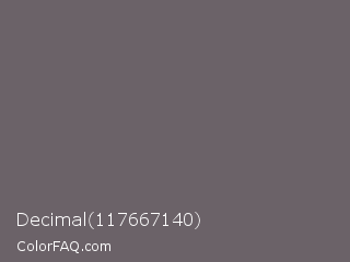 Decimal 117667140 Color is a normal magenta color and the nearest color is Granite Gray #676767. Hex code #6b6268 and RGB value is rgb(107,98,104). In RGB color space, this color is composed of 42% red, 38% green, 41% blue, In CMYK color space, this color is composed of 0% cyan, 8% magenta, 3% yellow , 58% black , In HSL color space, this color has a hue angle of 320° , 4% saturation and 40% lightness.