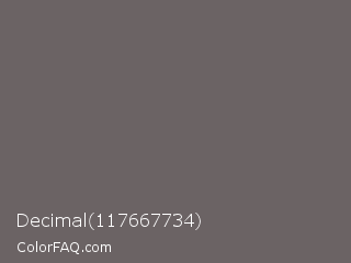 Decimal 117667734 Color is a normal red color and the nearest color is Scorpion #695f62. Hex code #6b6364 and RGB value is rgb(107,99,100). In RGB color space, this color is composed of 42% red, 39% green, 39% blue, In CMYK color space, this color is composed of 0% cyan, 7% magenta, 7% yellow , 58% black , In HSL color space, this color has a hue angle of 353° , 4% saturation and 40% lightness.