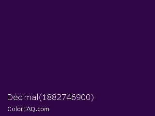 Decimal 1882746900 Color is a very dark purple color and the nearest color is Valentino #350e42. Hex code #320546 and RGB value is rgb(50,5,70). In RGB color space, this color is composed of 20% red, 2% green, 27% blue, In CMYK color space, this color is composed of 29% cyan, 93% magenta, 0% yellow , 73% black , In HSL color space, this color has a hue angle of 282° , 87% saturation and 15% lightness.