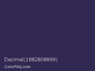 Decimal 1882808899 Color is a dark indigo color and the nearest color is Martinique #363050. Hex code #322953 and RGB value is rgb(50,41,83). In RGB color space, this color is composed of 20% red, 16% green, 33% blue, In CMYK color space, this color is composed of 40% cyan, 51% magenta, 0% yellow , 67% black , In HSL color space, this color has a hue angle of 253° , 34% saturation and 24% lightness.