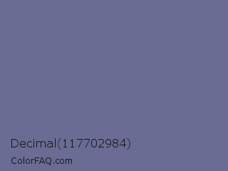 Decimal 117702984 Color is a normal blue color and the nearest color is Dark Blue Gray #666699. Hex code #6b6c94 and RGB value is rgb(107,108,148). In RGB color space, this color is composed of 42% red, 42% green, 58% blue, In CMYK color space, this color is composed of 28% cyan, 27% magenta, 0% yellow , 42% black , In HSL color space, this color has a hue angle of 239° , 16% saturation and 50% lightness.