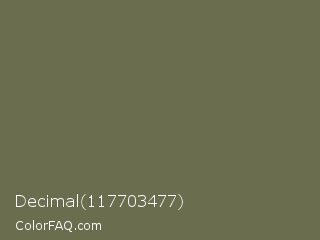 Decimal 117703477 Color is a normal yellow color and the nearest color is Go Ben #726d4e. Hex code #6b6d4f and RGB value is rgb(107,109,79). In RGB color space, this color is composed of 42% red, 43% green, 31% blue, In CMYK color space, this color is composed of 2% cyan, 0% magenta, 28% yellow , 57% black , In HSL color space, this color has a hue angle of 64° , 16% saturation and 37% lightness.