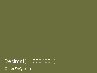 Decimal 117704051 Color is a normal yellow color and the nearest color is Yellow Metal #716338. Hex code #6b6e3d and RGB value is rgb(107,110,61). In RGB color space, this color is composed of 42% red, 43% green, 24% blue, In CMYK color space, this color is composed of 3% cyan, 0% magenta, 45% yellow , 57% black , In HSL color space, this color has a hue angle of 64° , 29% saturation and 34% lightness.