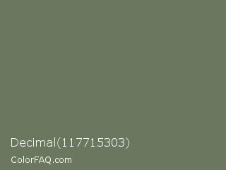 Decimal 117715303 Color is a normal green color and the nearest color is Willow Grove #65745d. Hex code #6b785f and RGB value is rgb(107,120,95). In RGB color space, this color is composed of 42% red, 47% green, 37% blue, In CMYK color space, this color is composed of 11% cyan, 0% magenta, 21% yellow , 53% black , In HSL color space, this color has a hue angle of 91° , 12% saturation and 42% lightness.