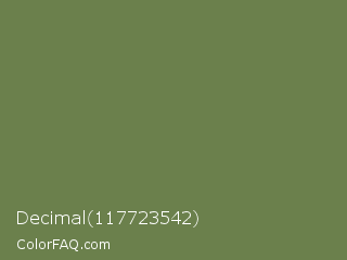 Decimal 117723542 Color is a normal green color and the nearest color is Dingley #5d7747. Hex code #6b804c and RGB value is rgb(107,128,76). In RGB color space, this color is composed of 42% red, 50% green, 30% blue, In CMYK color space, this color is composed of 16% cyan, 0% magenta, 41% yellow , 50% black , In HSL color space, this color has a hue angle of 84° , 25% saturation and 40% lightness.