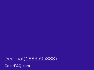 Decimal 1883595888 Color is a normal indigo color and the nearest color is Blue Gem #2c0e8c. Hex code #331496 and RGB value is rgb(51,20,150). In RGB color space, this color is composed of 20% red, 8% green, 59% blue, In CMYK color space, this color is composed of 66% cyan, 87% magenta, 0% yellow , 41% black , In HSL color space, this color has a hue angle of 254° , 76% saturation and 33% lightness.