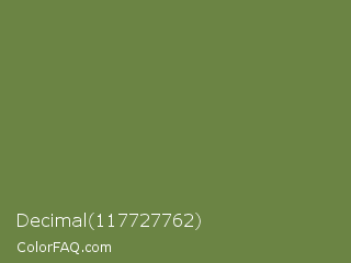 Decimal 117727762 Color is a normal green color and the nearest color is Dingley #5d7747. Hex code #6b8444 and RGB value is rgb(107,132,68). In RGB color space, this color is composed of 42% red, 52% green, 27% blue, In CMYK color space, this color is composed of 19% cyan, 0% magenta, 48% yellow , 48% black , In HSL color space, this color has a hue angle of 83° , 32% saturation and 39% lightness.