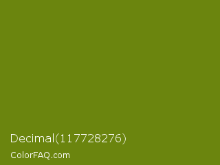 Decimal 117728276 Color is a dark lime color and the nearest color is Trendy Green #7c881a. Hex code #6b850e and RGB value is rgb(107,133,14). In RGB color space, this color is composed of 42% red, 52% green, 5% blue, In CMYK color space, this color is composed of 20% cyan, 0% magenta, 89% yellow , 48% black , In HSL color space, this color has a hue angle of 73° , 81% saturation and 29% lightness.