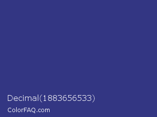 Decimal 1883656533 Color is a normal blue color and the nearest color is Cosmic Cobalt #2e2d88. Hex code #333683 and RGB value is rgb(51,54,131). In RGB color space, this color is composed of 20% red, 21% green, 51% blue, In CMYK color space, this color is composed of 61% cyan, 59% magenta, 0% yellow , 49% black , In HSL color space, this color has a hue angle of 238° , 44% saturation and 36% lightness.